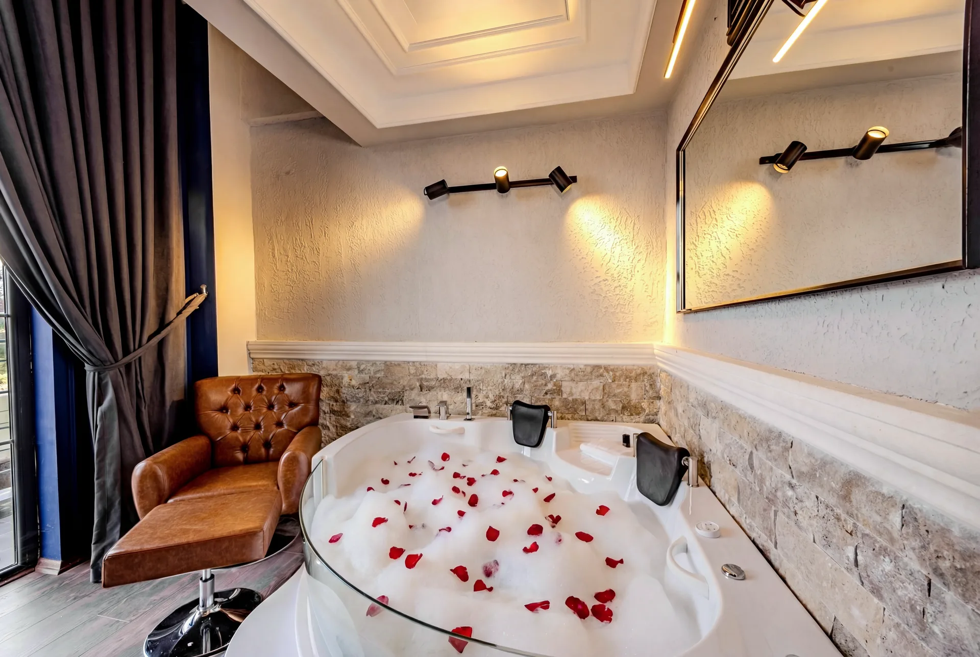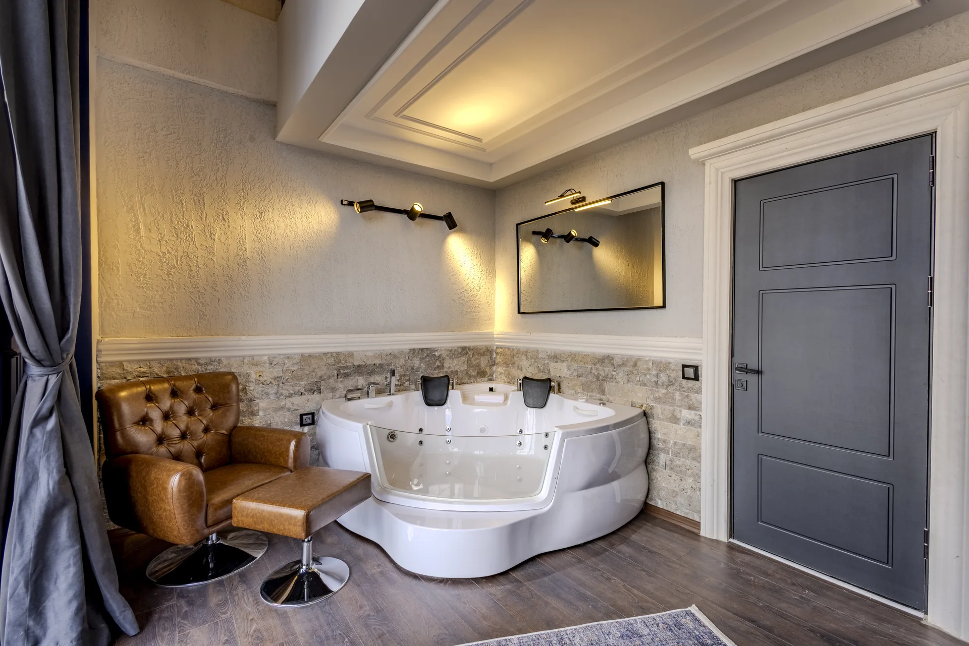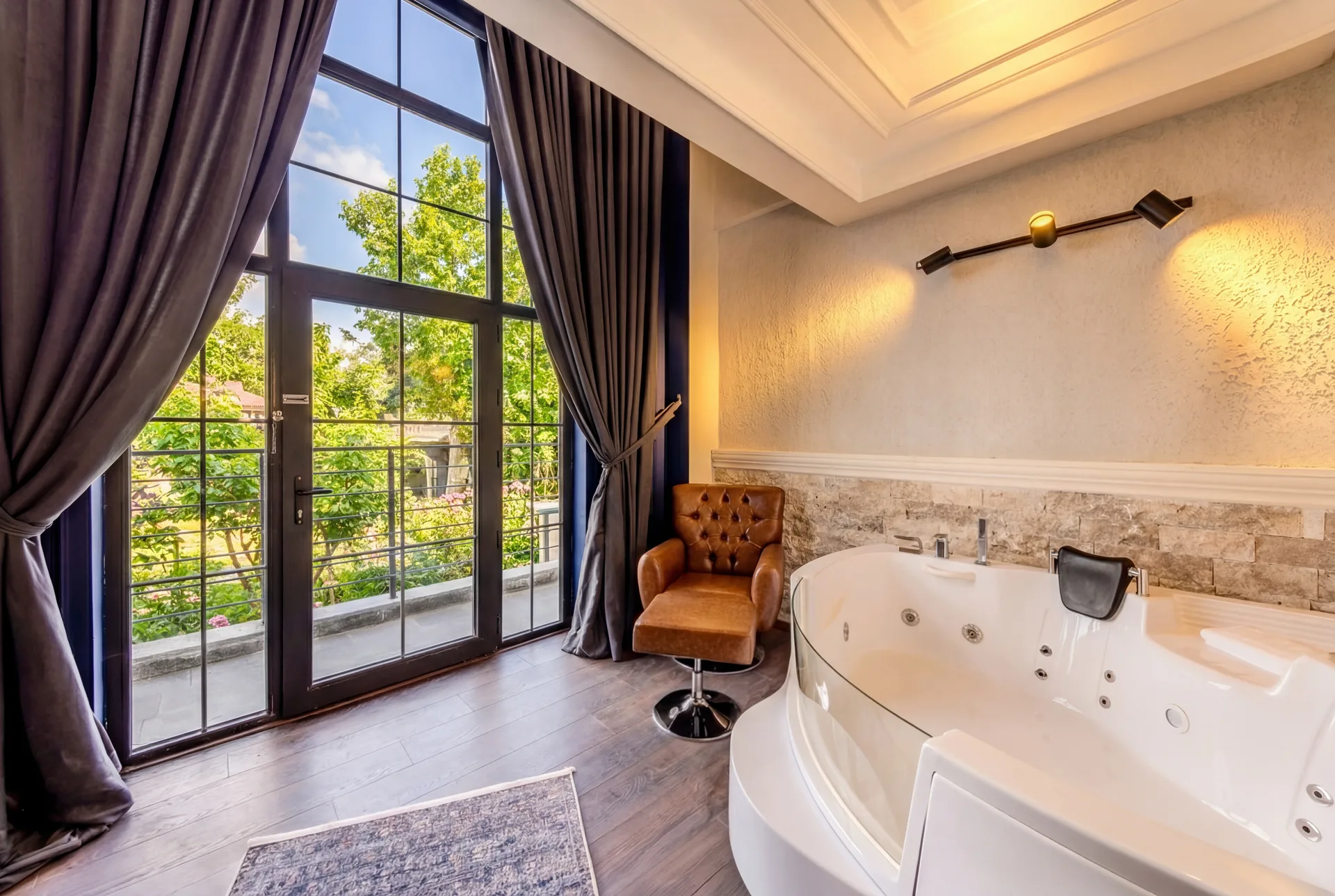 Each room is a two-storey loft featuring a private jacuzzi, king-size double bed, Smart TV, minibar (charged separately), and a peaceful courtyard view. Our hotel blends traditional charm with modern comfort, creating a warm and intimate atmosphere for every guest.